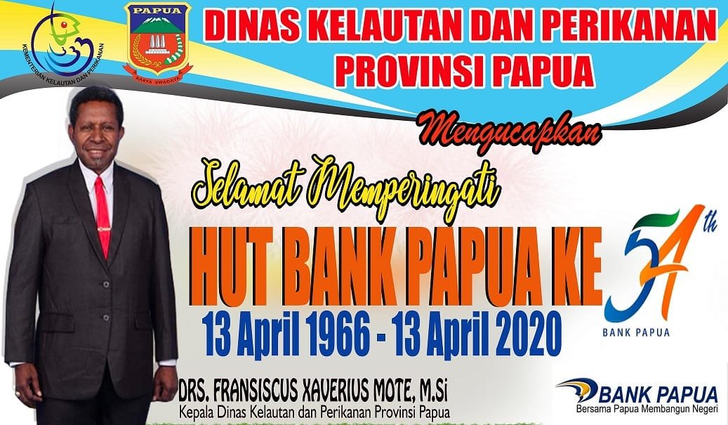 Hari ulang tahun Bank Papua jatuh pada hari ini, tanggal 13 April dan tanggal yang sama selalu di rayakan tiap tahun berjalan. Oleh sebab itu, kata kepala dinas perikanan dan kelautan Provinsi Papua Drs. Fransiskus Xaverius Mote, M.Si. Secara pribadi saya mengucapkan selamat merayakan hari ulang tahun bank Papua ke- 54 di seluruh tanah Papua.