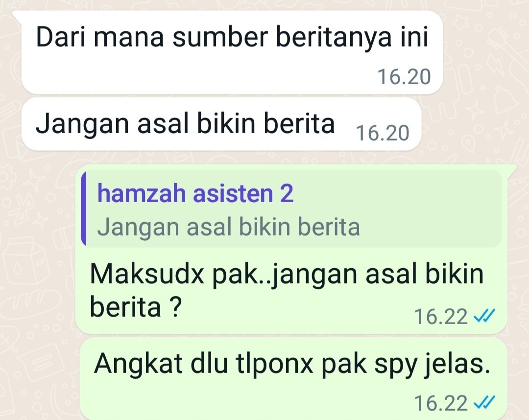 “Dari mana sumber beritanya ini, jangan asal bikin berita,” tulis Hamzah dalam balasan chatnya.