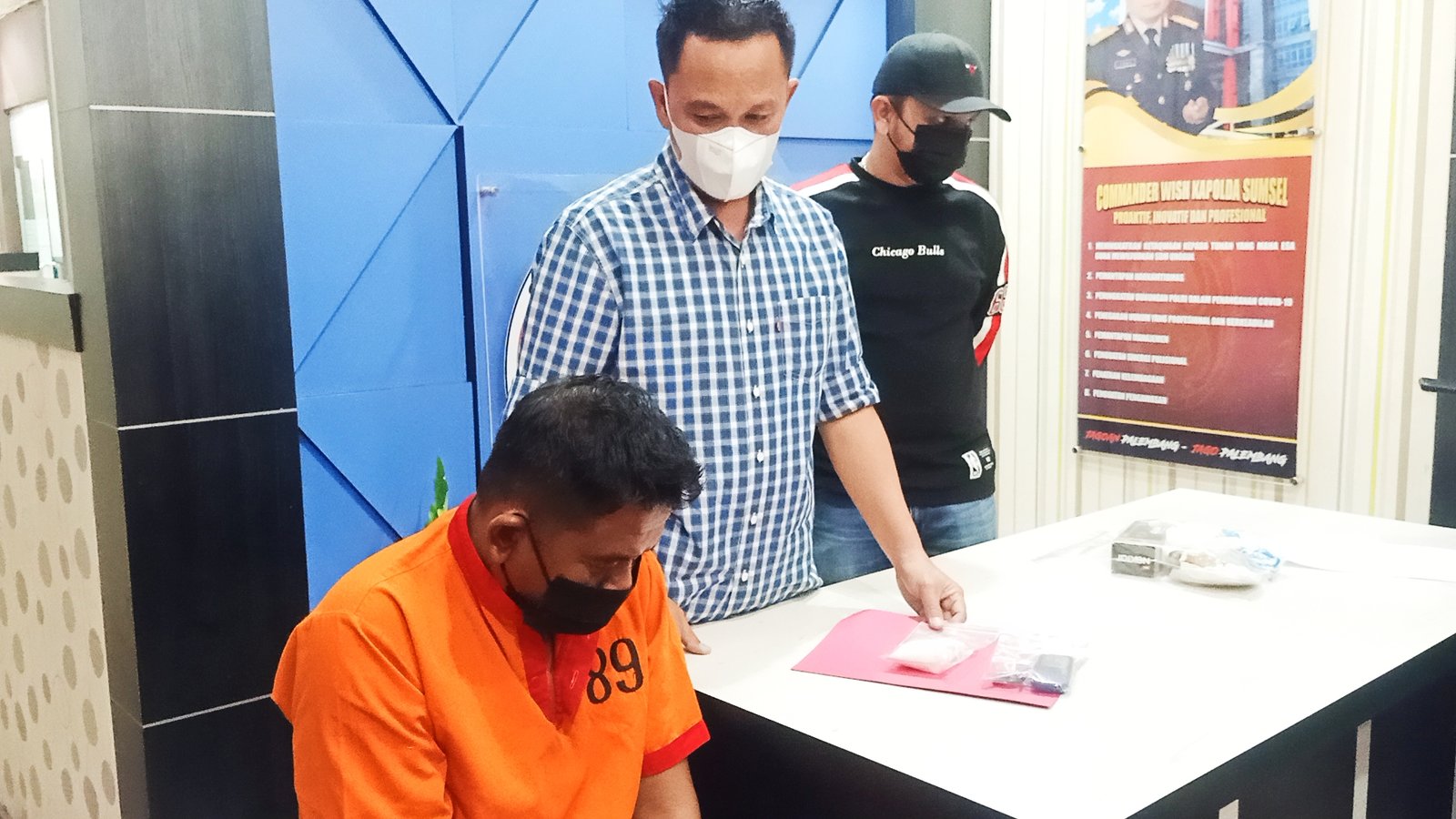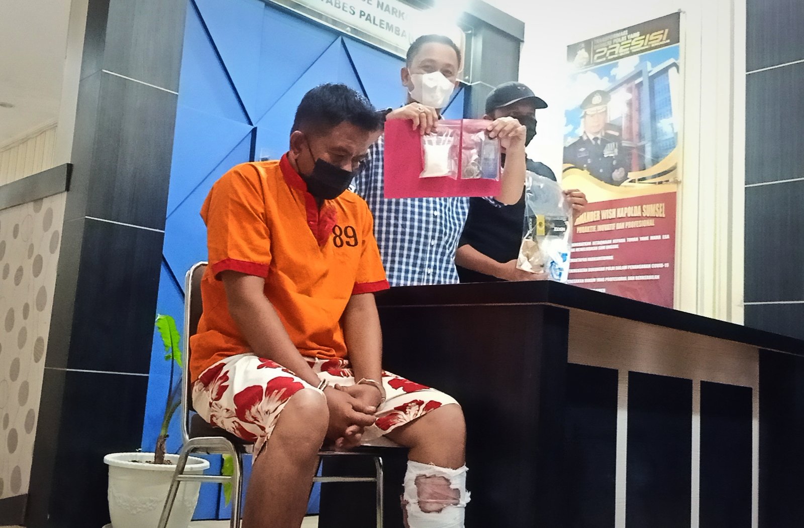 “Inilah langkah akhir kami menghadapi salah satu kaki tangan bandar yang nyaris mencelakakan keselamatan anggota kita, saat melakukan penangkapan di Jalan Ki Merogan Kelurahan Kemang Agung Kecamatan Kertapati Palembang. Dari tangannya, turut kita sita sabu seberat 101,92 gram, plastik transparan, kantong plastik dan sepeda motor Honda Supra Fit Dengan Nopol BG 4910 PY,” jelas Kapolrestabes Palembang, Kombes Pol Irvan Prawira Satyaputra, melalui Kasat Reserse Narkoba, Kompol Mario Ivanry, saat press release.
