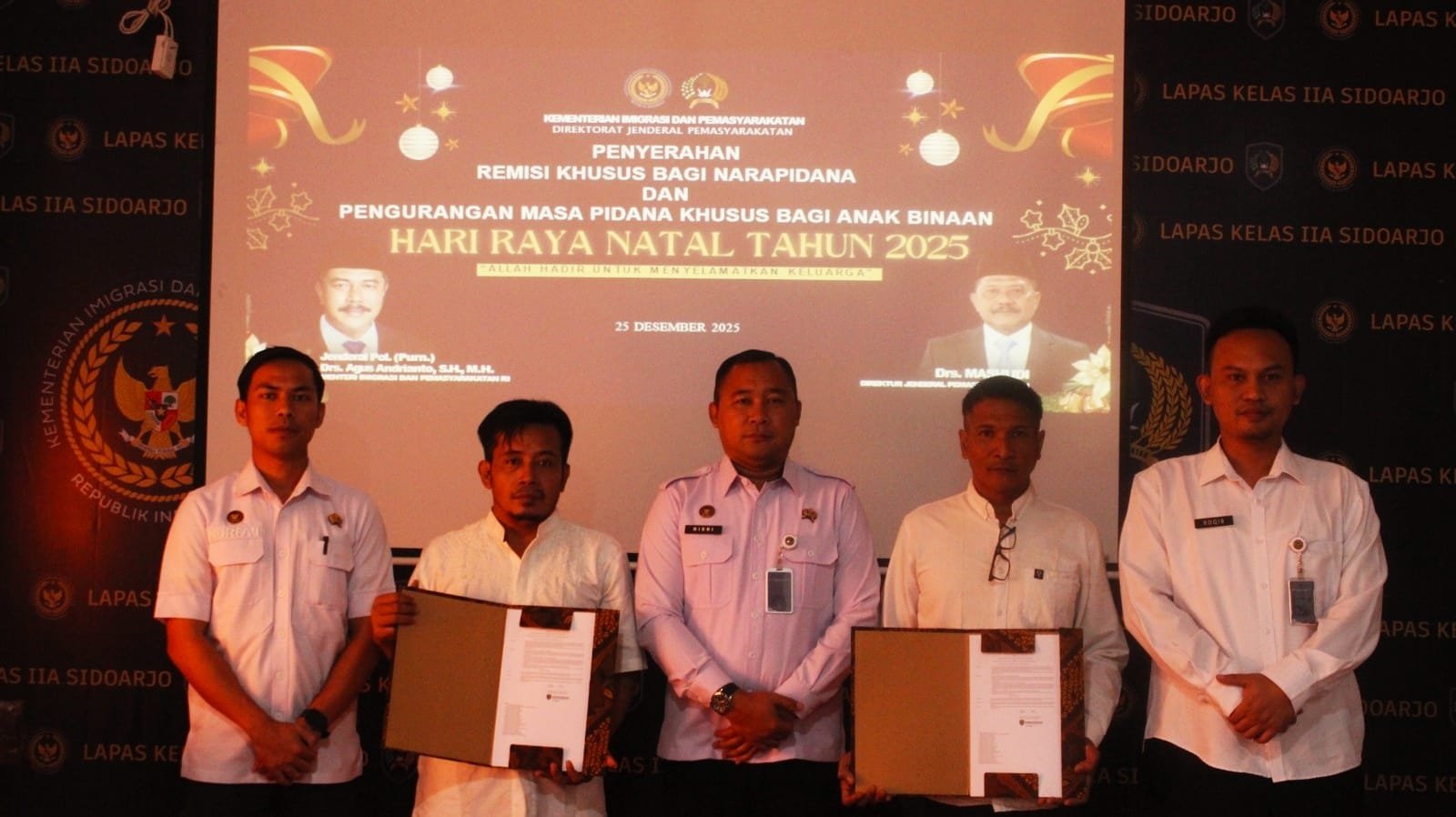 MATTANEWS.CO, SIDOARJO – Perayaan Hari Raya Natal 2025, Lapas Kelas IIA Sidoarjo Kantor Wilayah Direktorat Jenderal Pemasyarakatan Jawa Timur melaksanakan kegiatan Pemberian Remisi Khusus Natal kepada Warga Binaan Pemasyarakatan (WBP) yang berlangsung di Aula Atas Lapas Sidoarjo, Kamis (25/12/2025).
