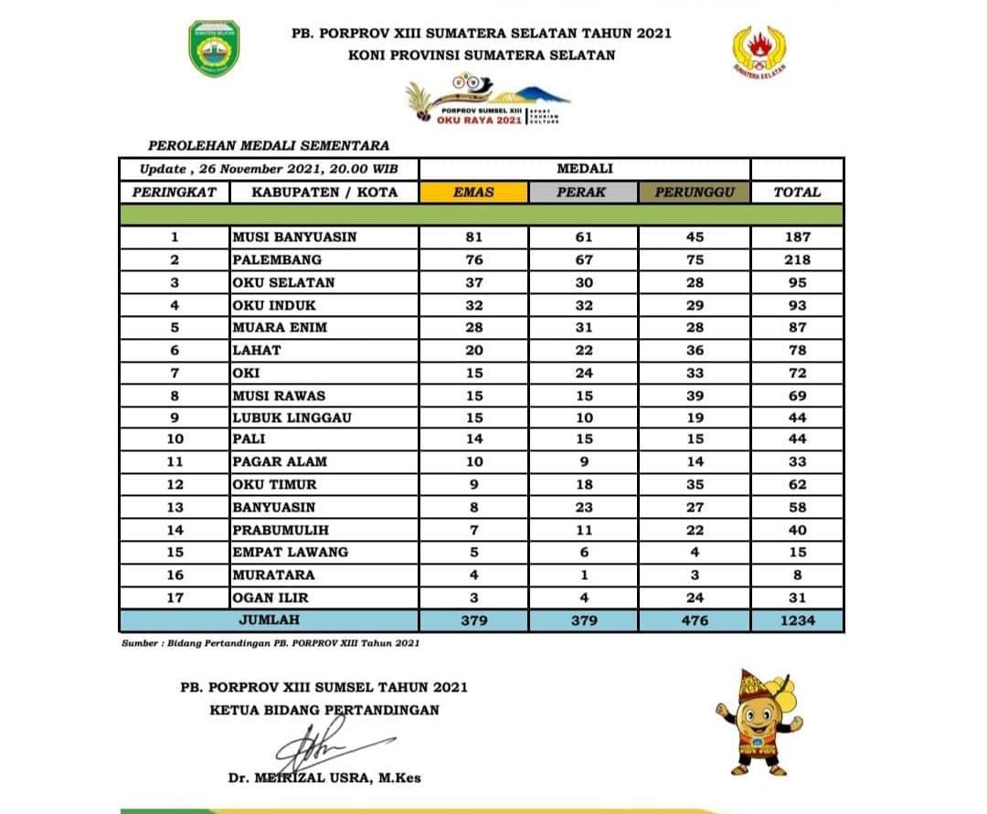 Hal ini diketahui berdasarkan hasil rekapitulasi resmi data PB Porprov, Jumat (26/11/2021) pukul 20.00 WIB. Adapun peraihan medali kontingen Muba yakni medali emas 81, medali perak 61, dan medali perunggu 45.