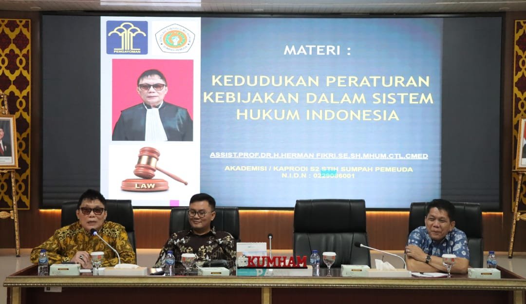 Acara tersebut menghadirkan narasumber dari Sekolah Tinggi Ilmu Hukum Sumpah Pemuda yakni Prof. Dr. H. Firman Freaddy Busroh dan Dr. H. Herman Fikri Teguh, serta diikuti para perancang Kanwil Kemenkumham Sumsel juga dari Biro Hukum Pemerintah Provinsi.