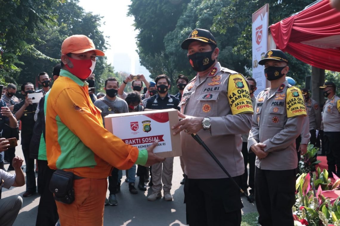 JAKARTA, Mattanews.co – Dalam rangka HUT ke-75 Kemerdekaan Republik Indonesia, Polda Metro Jaya menggelar bakti sosial dengan membagikan 15.000 paket sembako ke warga kurang mampu yang terdampak pandemi Virus Corona (Covid-19), Rabu (19/8/2020).