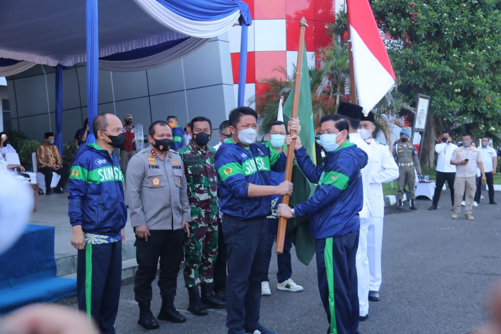 MATTANEWS.CO, PALEMBANG – Kapolda Sumatera Selatan (Sumsel) Irjen Pol Drs Toni Harmanto mendampingi Gubernur Sumsel, H Herman Deru (HD) saat melepas kontingen Pekan Olahraga Nasional (PON) XX Papua, di Gelora Sriwijara Jakabaring (JSC), Palembang, Rabu (15/9/2021).