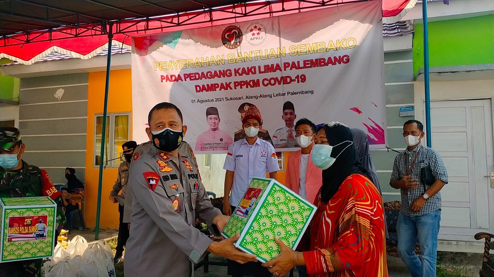 MATTANEWS.CO, PALEMBANG – Kapolda Sumatera Selatan (Sumsel), Irjen Pol Prof Dr Eko Indra Heri S didampingi Ketua Umum Gerakan Cinta Rakyat (Gencar) Indonesia menggelar bakti sosial (baksos), ke Asosiasi Pedagang Kaki Lima Indonesia (APKLI) Palembang, di Komplek Grand Permai, Kecamatan Alang-alang lebar, Palembang, Minggu (1/8/2021).
