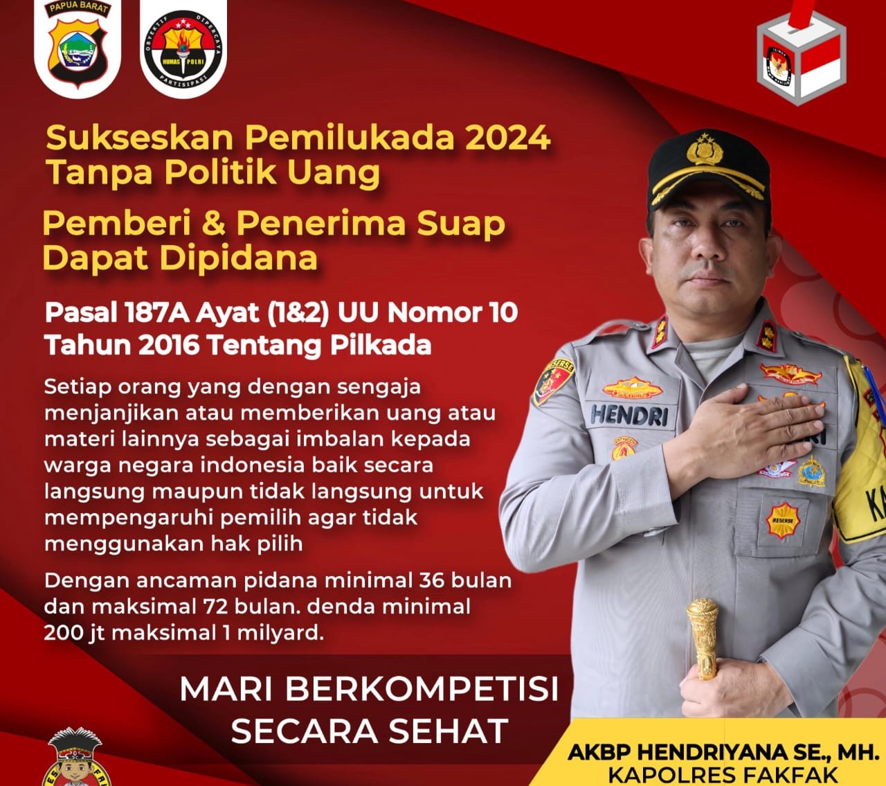 MATTANEWS.CO,FAKFAK – Kapolres Fakfak AKBP Hendriyana SE,MH, mengimbau kepada masyaralat Fakfak agar menghindari politik uang atau money politic menjelang Pemilihan Kepala Daerah (Pilkada) serentak 27 November 2024 mendatang.