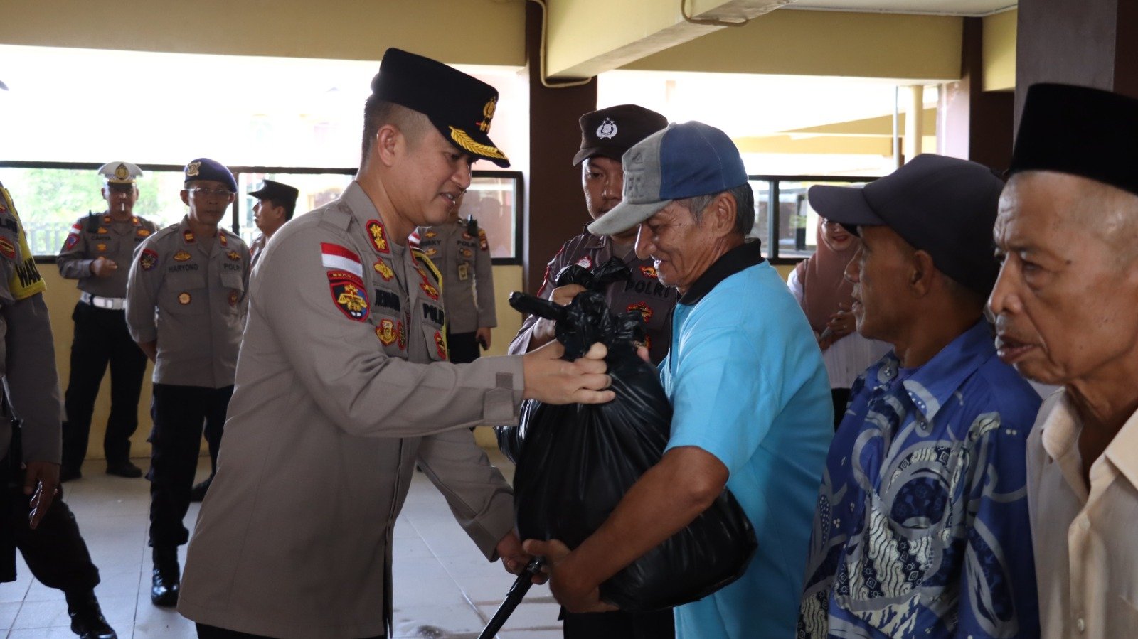 Penyerahan bantuan sosial dihadiri, Pejabat Utama (PJU) Polres, Sat Binmas, para Kepala Unit (Kanit) Binmas Polsek dan Bhabinkamtibmas serta masyarakat penerima Bansos.