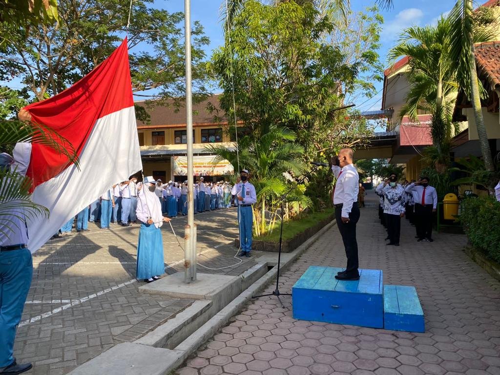 Kasat Narkoba Polres Tulungagung AKP Didik Riyanto, S.H., M.H., saat menjadi inspektur upacara di SMA Negeri 1 Kauman setempat, Senin (25/7) Foto:Doc Polres Tulungagung