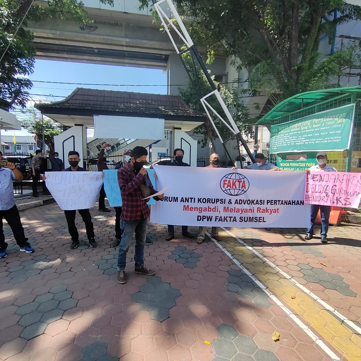 MATTANEWS.CO, PALEMBANG – Forum Anti Korupsi dan Advokasi Pertanahan (FAKTA) Sumatera Selatan menggelar aksi demo di halaman Pengadilan Negeri (PN) Palembang, Kamis (16/9). Aksi ini sendiri berisikan tuntutan terhadap kinerja aparat penegak hukum, terutama pihak dari Pengadilan Negeri (PN) Palembang atas kasus perebutan sebidang tanah yang berada di jalan siaran Sako seluas 1,5 ha.
