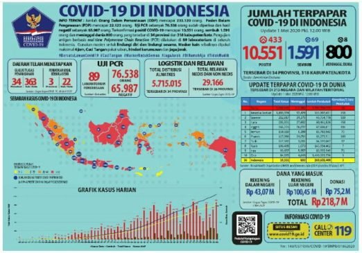 JAKARTA, Mattanews.co– Pemerintah Indonesia melalui Gugus Tugas Percepatan Penanganan COVID-19 mencatat jumlah kasus terkonfirmasi positif COVID-19 per hari ini Jumat (1/5/2020) menjadi 10.551 setelah ada penambahan 433 orang. Sedangkan pasien yang dinyatakan sembuh menjadi 1.591 setelah ada penambahan sebanyak 69 orang.