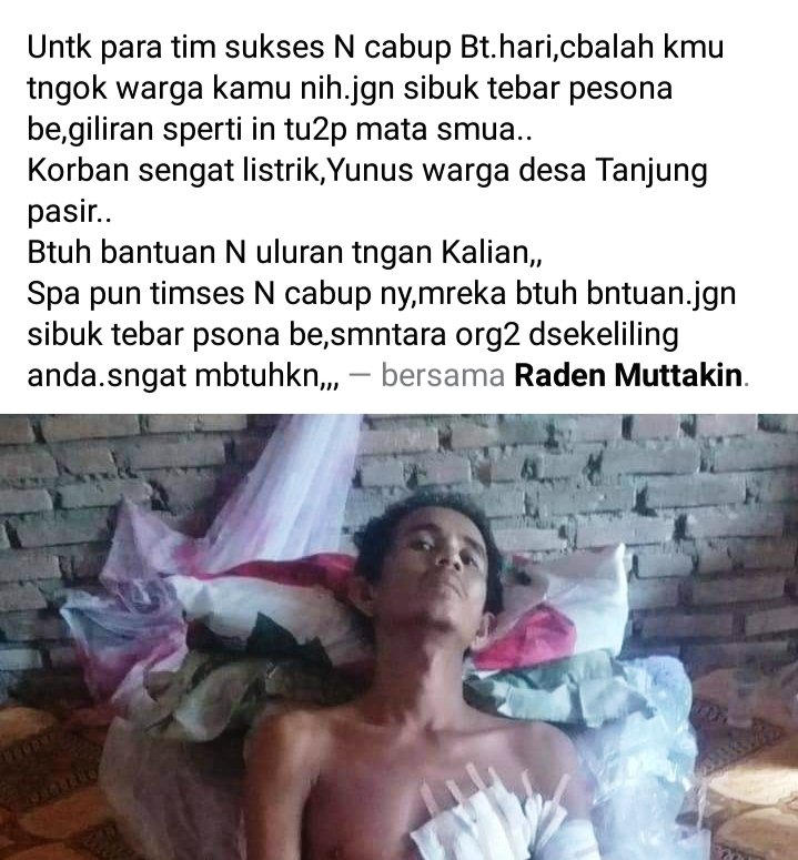 “Korban tersengat listrik, atas nama Yunus. Butuh bantuan dan ukuran tangan, siapapun timsesnya, cabupnya, mereka membutuhkan uluran tangan, jangan sibuk tebar pesona saja sementara orang-orang disekeliling anda sangat membutuhkan” tulisnya, Rabu (11/3/2020).