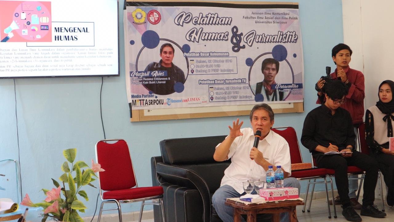 Acara tersebut dihadiri oleh Oemar Madri Bafadhal, S.Ikom., M. Si selaku dosen Ilmu Komunikasi FISIP Unsri, sekaligus ketua Laboratorium Ilmu Komunikasi dan tiga puluh peserta pelatihan kehumasan dari jurusan Ilmu Komunikasi Universitas Sriwijaya (Unsri) Indralaya dan Pemimpin Redaksi ekbisnews.com dan Kaki Bukit Literasi Maspril Aries.
