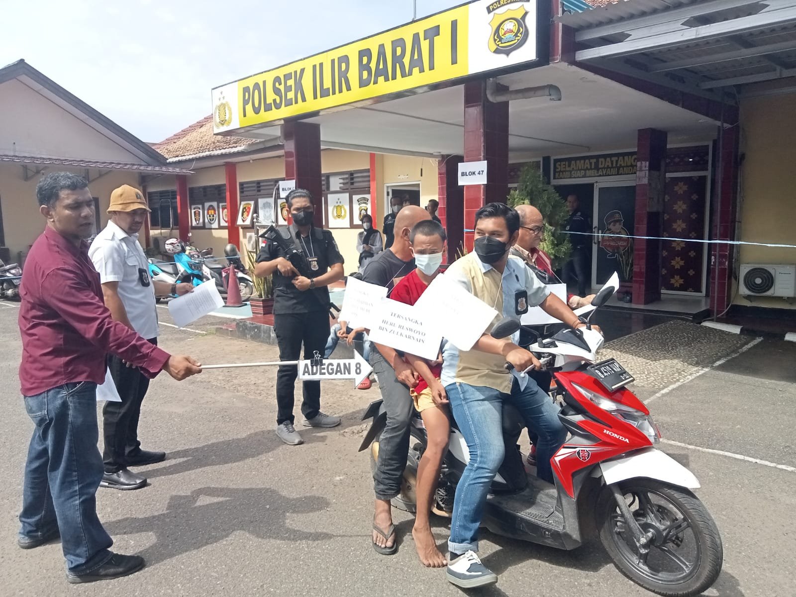Kedua pelaku dihadirkan yakni HR (16) dan M. Risky (23) dengan menggunakan baju tahanan berwarna merah. Reka ulang ini digelar di Polsek Ilir Barat I, dan diikuti baik oleh Kanit maupun Panit Ilir Barat I. Tak hanya itu saja, dalam reka ulang ini hadir pula pihak keluarga korban Nanda dan juga kuasa hukumnya.