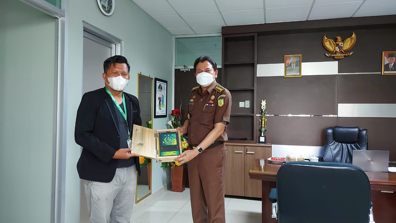 Penyerahan penghargaan (plakat) dan tongkat langsung di sambut dan diterima Kajati Sumsel, M Rum melalui As Intel, I Gede Ngurah Sriada didampingi Kepala Kasi “B” Sosial Budaya dan Kemasyarakatan, M Ikbal dan Kasi Penkum Kajati Sumsel, Mohd Radyan.
