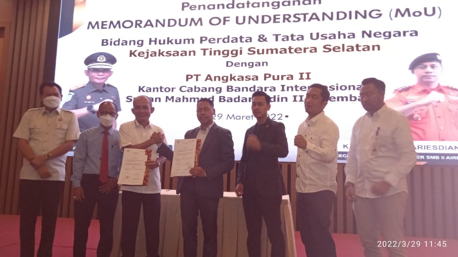 MATTANEWS.CO, PALEMBANG – Kejaksaan Tinggi (Kejati) Sumsel dan PT Angkasa Pura (AP) II Kantor Cabang Bandara Internasional Sultan Mahmud Badaruddin (SMB) II Palembang, kembali menjalin Memorandum of Understanding (MoU), Selasa (29/3/2022).
