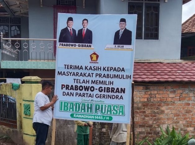 Dewan Pimpinan Cabang (DPC) Partai Gerindra melalui Ketua Dewan Penasehat nya H. Arlan menyebar ratusan Baleho ucapan bertuliskan “Terima Kasih Kepada Masyarakat Prabumulih Yang Telah Memilih Prabowo-Gibran dan Partai Gerindra”.