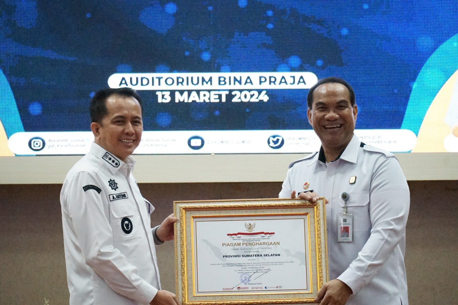 MATTANEWS.CO, PALEMBANG – Kementerian Hukum dan HAM Republik Indonesia memberikan piagam penghargaan Kabupaten/Kota Peduli HAM untuk Gubernur Provinsi Sumatera Selatan, penghargaan tersebut diberikan lantaran Pemprov Sumsel dinilai telah berhasil membina dan membangun Sebagian kabupaten/kota Peduli HAM di wilayah Sumatera Selatan.
