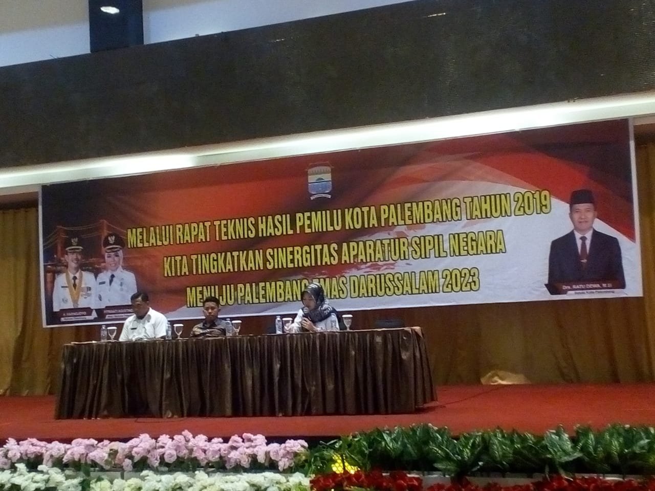 “Rapat teknis hasil pemilihan umum 2019 lalu kita evaluasi. Apakah hasil pemilu yang lalu telah berhasil. Kalau ada kekurangan bisa diketahui dimana letak kelemahannya,” jelas Sekban Kesbangpol Kota Palembang Bambang Wicaksono saat ditanyai saat kegiatan rapat teknis hasil pemilu kota Palembang 2019 di Grand Atyasa convertion Center Rabu (30/10/2019).