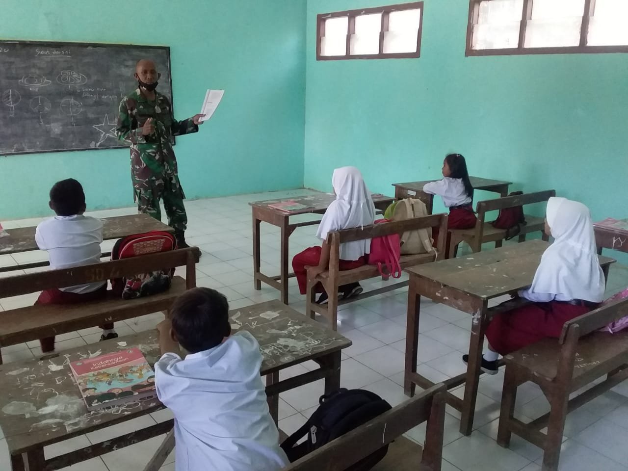 KENDAL, Mattanews.co – Di medan tugas, seorang tentara harus bisa menjadi apa saja sepanjang hal itu dibutuhkan demi terlaksananya tugas yang diamanahkan. Seperti yang dilakukan para anggota kodim 0715/Kendal saat mengajar para murid SDN 4 Sendang Kulon, Selasa (14/09/2020).