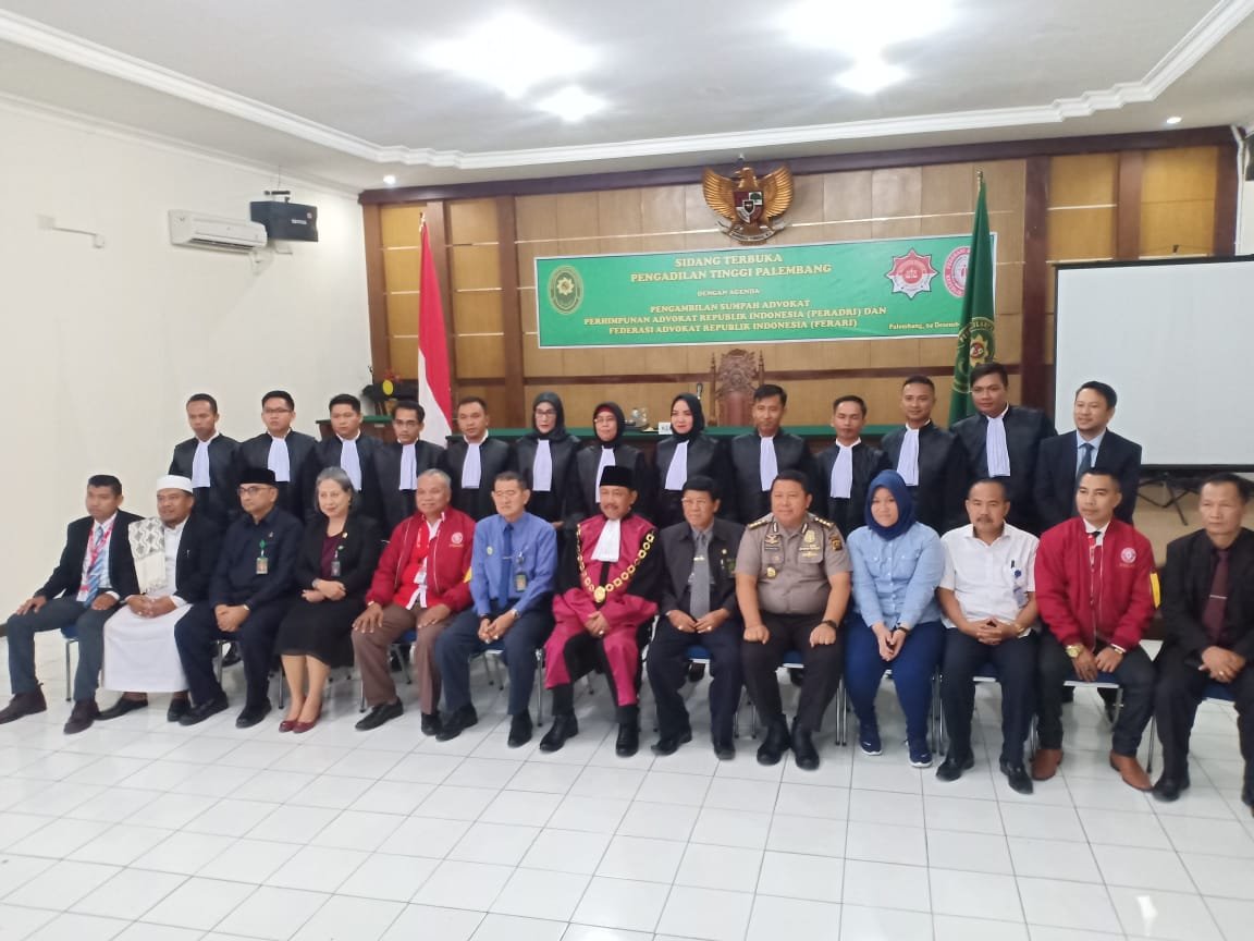 Palembang, Mattanews.co – Ketua Pengadilan Tinggi Palembang Soedarmadji memimpin pengambilan sumpah sejumlah advokat dari Federasi Advokat Republik Indonesia (FERARI).