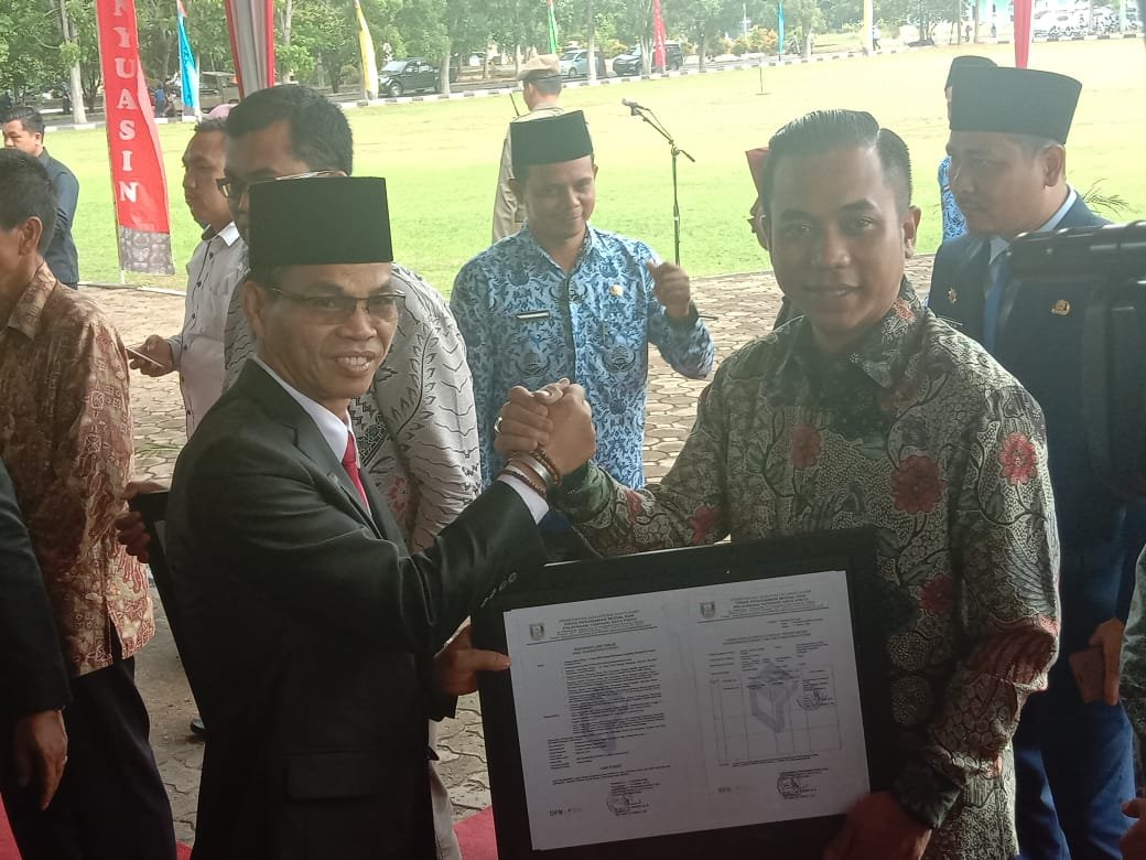 Bupati Banyuasin Askolani dan pejabat lainnya memberikan penghargaan dan bantuan secara bergantian atau simbolis.