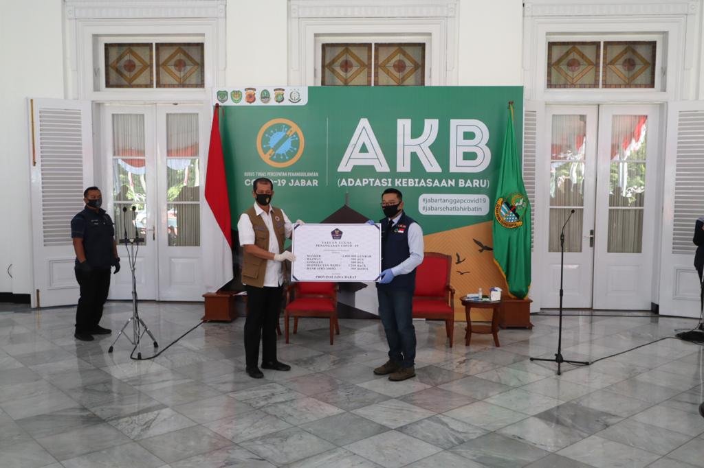 Doni Monardo yang juga Kepala BNPB menyerahkan bantuan tersebut kepada Gubernur Jawa Barat Muhammad Ridwan Kamil di Gedung Negara Pakuan, Bandung, Jawa Barat, pada Kamis (6/8). Bantuan Satgas Penanganan COVID-19 atau Satgas Nasional berupa masker 2 juta buah, baju hazmat 500 buah, kacamata atau google 500 buah, disinfektan 1.260 pak dan hand spray berukuran 360 ml 360 botol.