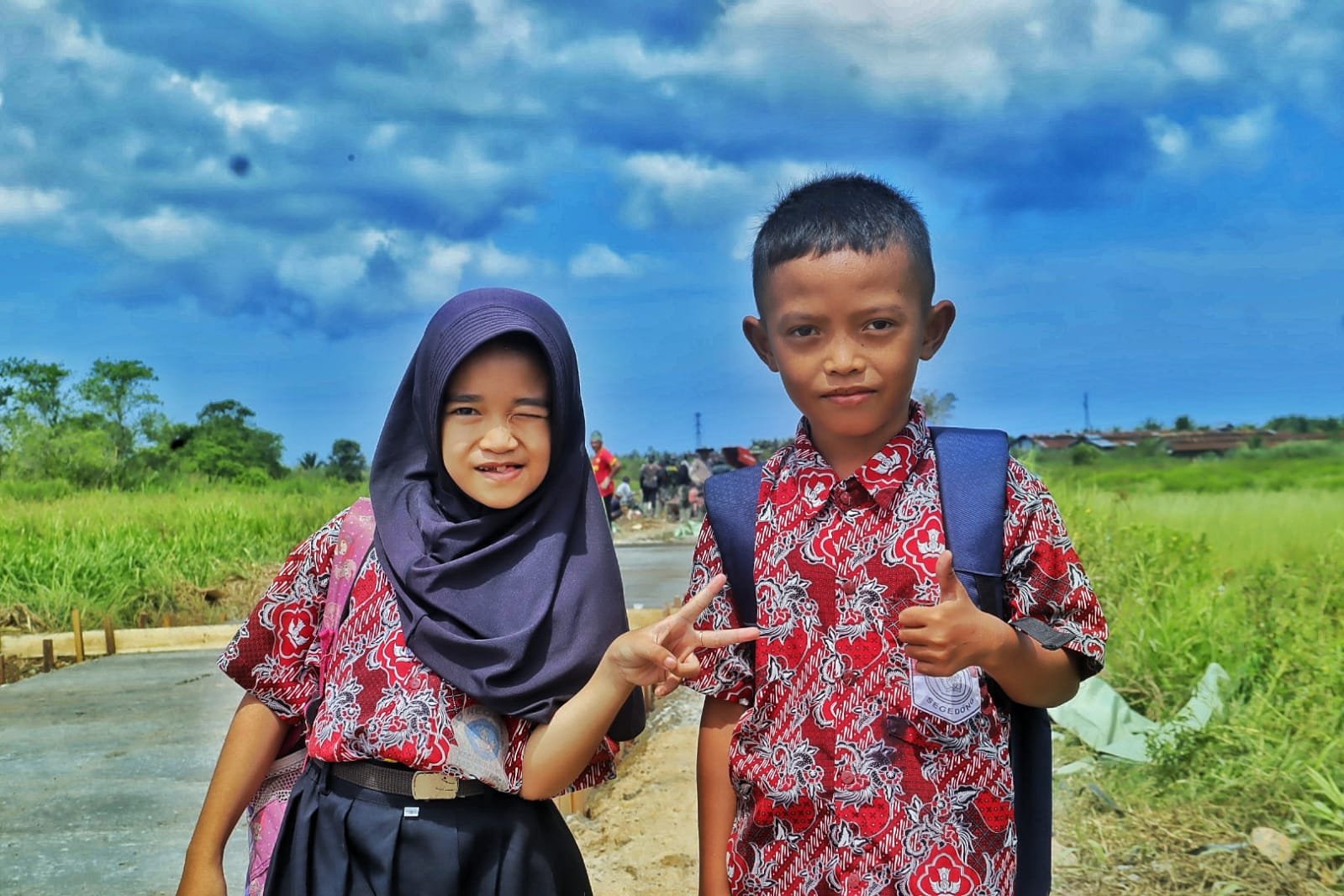 Di tengah perjalanan mereka menuju sekolah, jalan rabat beton yang sedang dalam proses pembangunan tak menyurutkan semangat keduanya untuk tetap belajar.