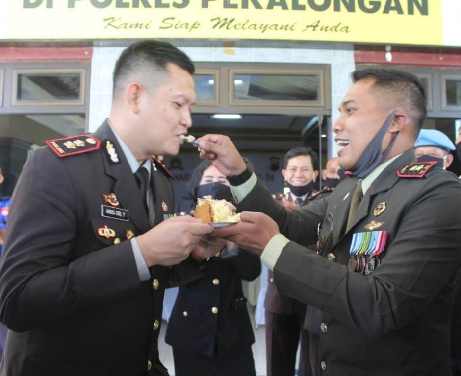 Kejutan diberikan berupa kue ulang tahun yang bertuliskan Hari Bhayangkara ke-74. Momen romantis saat Dandim 0710/Pekalongan menyuapi Kapolres Pekalongan. Saat itu suasana haru dan penuh kebersamaan pun terjadi.