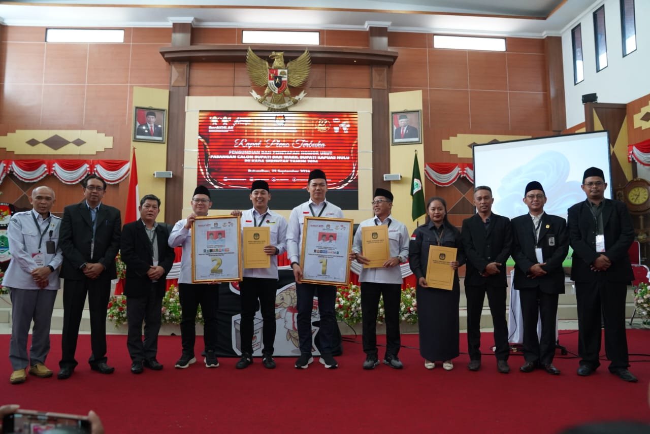 MATTANEWS.CO, KAPUAS HULU – Komisi Pemilihan Umum (KPU) Kabupaten Kapuas Hulu, telah mengundi Nomor Urut Pasangan Calon Bupati – Wakil Bupati yang akan maju di Pemilihan Bupati – Wakil Bupati Kapuas Hulu 2024 nanti. Pelaksanaan pengundian nomor urut pasangan calon dari dua pasangan yang maju di Pilkada Kabupaten Kapuas Hulu, berlangsung di Gedung DPRD Kabupaten Kapuas Hulu pada Senin (23/9/2024).