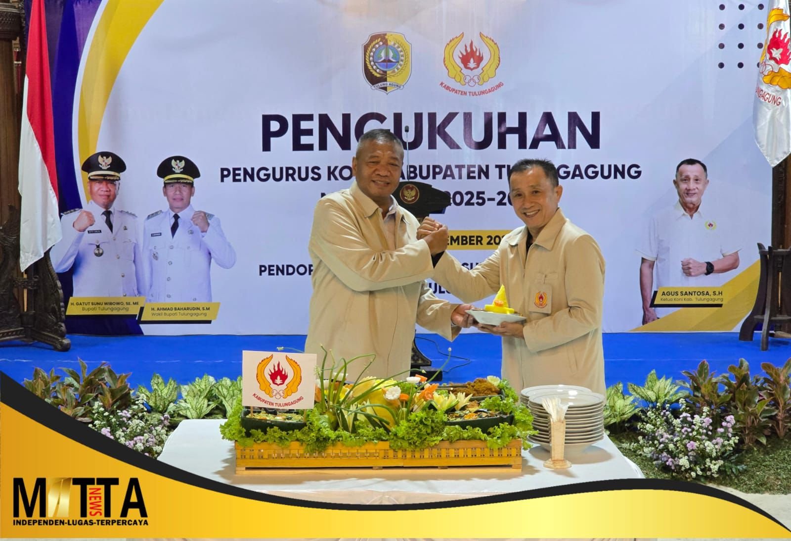 MATTANEWS.CO, TULUNGAGUNG – Komitmen membangkitkan prestasi olahraga daerah ditegaskan Pemerintah Kabupaten Tulungagung, Provinsi Jawa Timur. Pengurus Komite Olahraga Nasional Indonesia Kabupaten Tulungagung masa bakti 2025–2029 resmi dikukuhkan dalam prosesi khidmat di Pendopo Kongas Arum Kusumaning Bongso, Selasa (23/12/2025) malam. Bupati Tulungagung Gatut Sunu Wibowo, S.E., M.E., secara tegas memasang target ambisius tembus 10 besar pada Porprov 2027.
