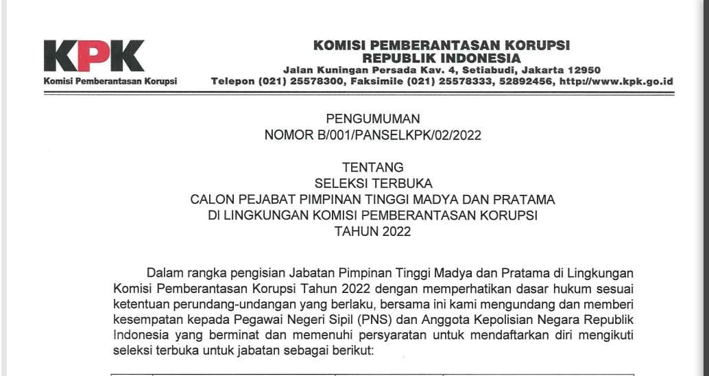 MATTANEWS.CO, ACEH TAMIANG – Dalam rangka pengisian Jabatan Pimpinan Tinggi Madya dan Pratama dilingkungan Komisi Pemberantasan Korupsi tahun 2022. KPK RI buka seleksi terbuka calon pejabat tinggi madya dan pratama bagi Pegawai Negeri Sipil (PNS) dan Anggota Kepolisian Negara Republik Indonesia, Selasa (15/2/2022).