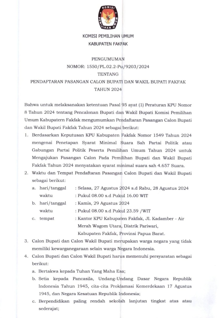 nomor: 1550/PL.02.2-Pu/9203/2024 yang ditandatangani langsung Ketua KPU Kabupaten Fakfak, Hendra J. C. Talla yang dikeluarkan pada Jumat 23 Agustus 2024.