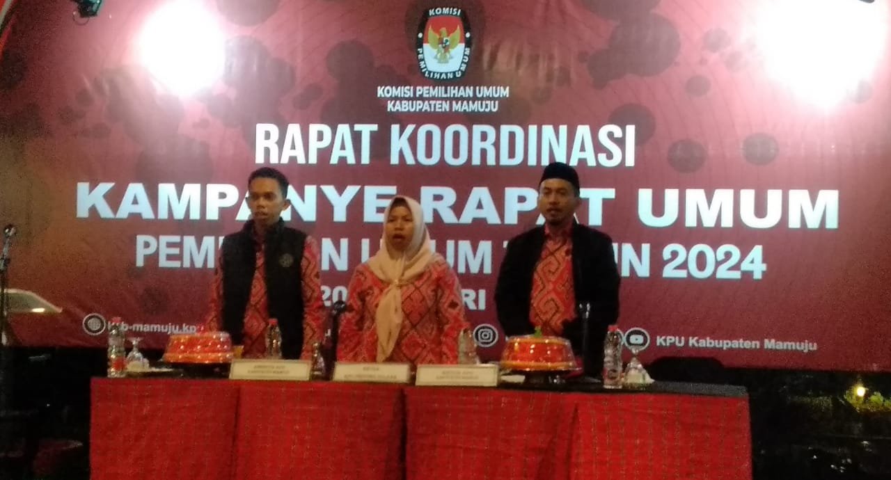 MATTANEWS.CO,SULBAR– Komisi Pemilihan Umum (KPU) Kabupaten Mamuju menggelar rapat koordinasi kampanye rapat umum pemilihan umum tahun 2024 yang berlangsung di Plaza Waterpark Grand Maleo Hotel & Convention Mamuju, Sabtu (20/1/2024)