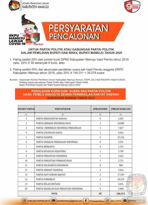 Nah terkait persyaratan ia meminta kepada partai politik atau gabungan partai politik, agar memenuhi paling sedikit 20 persen dari jumlah kursi DPRD Mamuju hasil Pemilu tahun 2019.