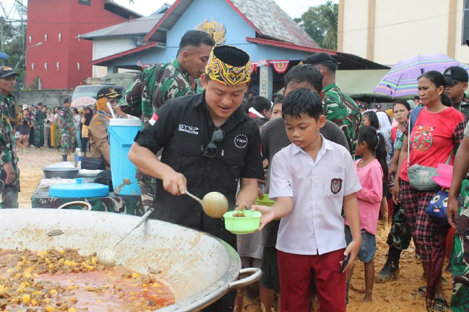 Tidak hanya menyajikan aksi memasak dalam skala besar menggunakan peralatan dapur raksasa, kegiatan ini juga menghadirkan kepedulian nyata berupa pembagian ratusan paket sembako kepada masyarakat di wilayah perbatasan.