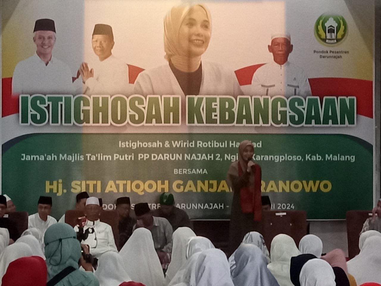 MATTANEWS.CO, MALANG – Kunjungan Hj.Siti Atiqoh Ke Malang Jawa Timur, dalam kunjungannya tersebut Istri dari Capres Ganjar Pranowo menuju ke Pendopo Aspirasi Ahmad Basarah untuk bertemu dengan sejumlah kader PDI-Perjuangan, usai melaksanakan pertemuan tersebut Hj.Siti Atiqoh langsung menghadiri Istiqosah Kebangsaan, Istiqosah dan Wirid Rotibul Haddad bersama Jama’ah Majelis Taklim Putri Pondok Pesantren Darun Najah 2Karangploso Kabupaten Malang pada Sabtu, (27/1/2024).