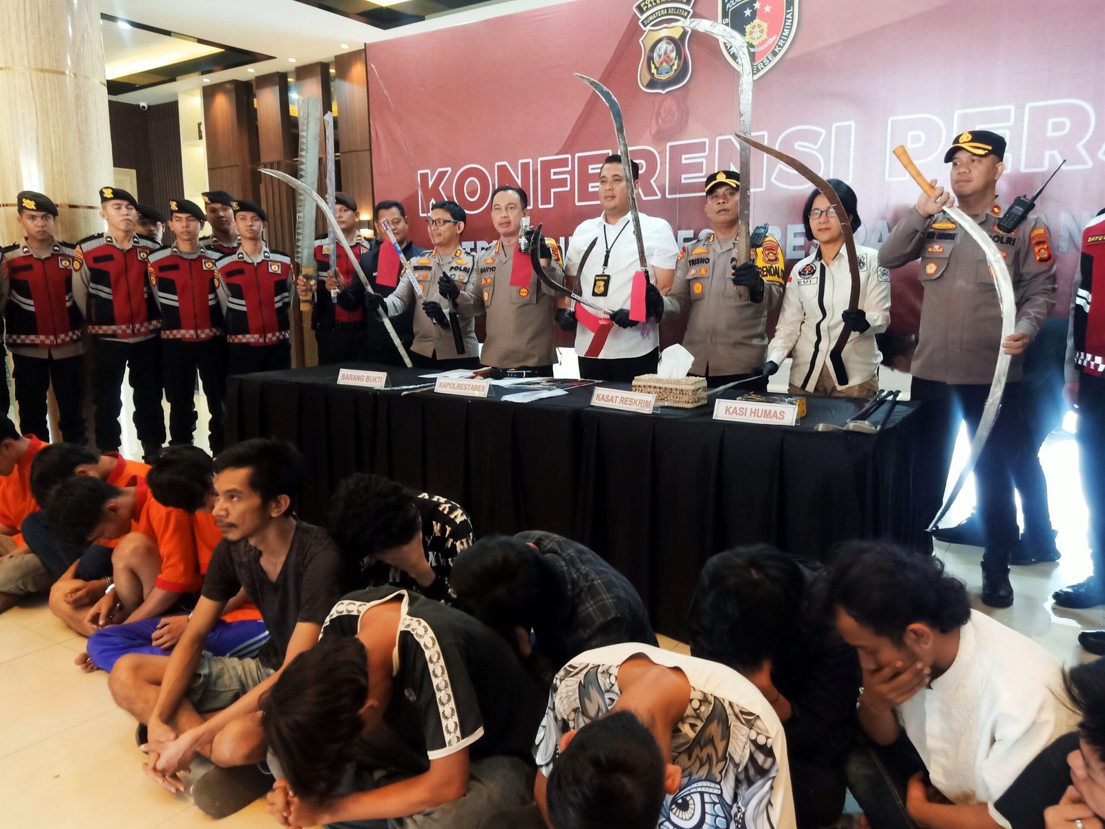 “Benar, 16 pelaku tawuran ini kami amankan dari dua lokasi berbeda, yaitu ada di Jalan KH Wahid Hasyim, Jembatan Ogan, Kelurahan 1 Ulu, dengan delapan pelaku dan ada juga di Jalan Ganda Subrata, Komplek Yuka, Kelurahan Sukamaju, Kecamatan Sako, dengan lima pelaku,” papar Kapolrestabes Palembang, Kombes Pol Harryo Sugihhartono, didampingi Kasat Reskrim, AKBP Haris Dinzah dan Kapolsek SU I, Kompol Alex Andriyan, saat press release.
