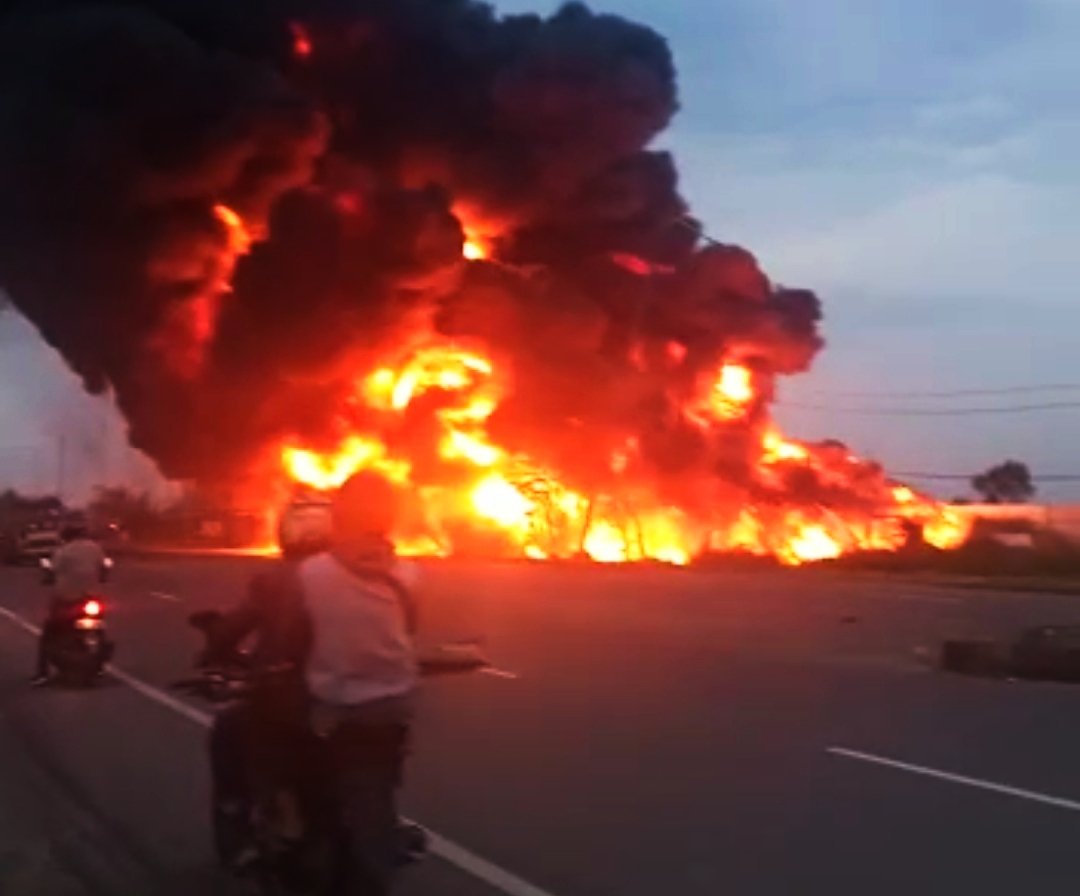 MATTANEWS.CO, PALEMBANG – Lagi, salah satu lokasi penampungan minyak ilegal terbakar. Spontan, kejadian ini membuat kemacetan panjang, karena dentuman dan api membumbung tinggi di depan gerbang masuk Tol Palembang – Inderalaya (Palindra), Jalan Singa, Kecamatan Pemulutan, Kabupaten Ogan Ilir terbakar hebat, Sabtu (4/12/2021) sore.