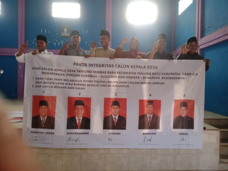 MATTANEWS.CO, OGAN ILIR – Lima Calon Kepala Desa (Cakades) Tanjung Tambak Baru, Tanjung Batu, Ogan Ilir menandatangani surat kesepakatan menolak politik uang, di ruang serbaguna desa setempat, Kamis (18/8/2022).