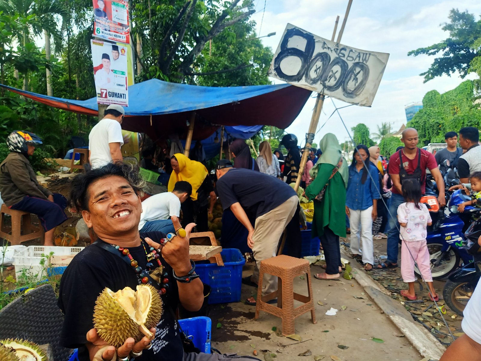 “Alhamdullilah dalam sehari habis terjual sekitar 2 juta buah duren. Dari kalangan menengah hingga bawah bisa mencicipi buah duren. Bahkan mereka bisa memilih, mau duren dari harga paling mahal Rp 35 ribu hingga ke paling murah Rp 5 ribu,” jelas Pemilik Lapak Jambul, Anton Dogan Jambu Lolo (44), ketika diwawancarai wartawan Mattanews.co.