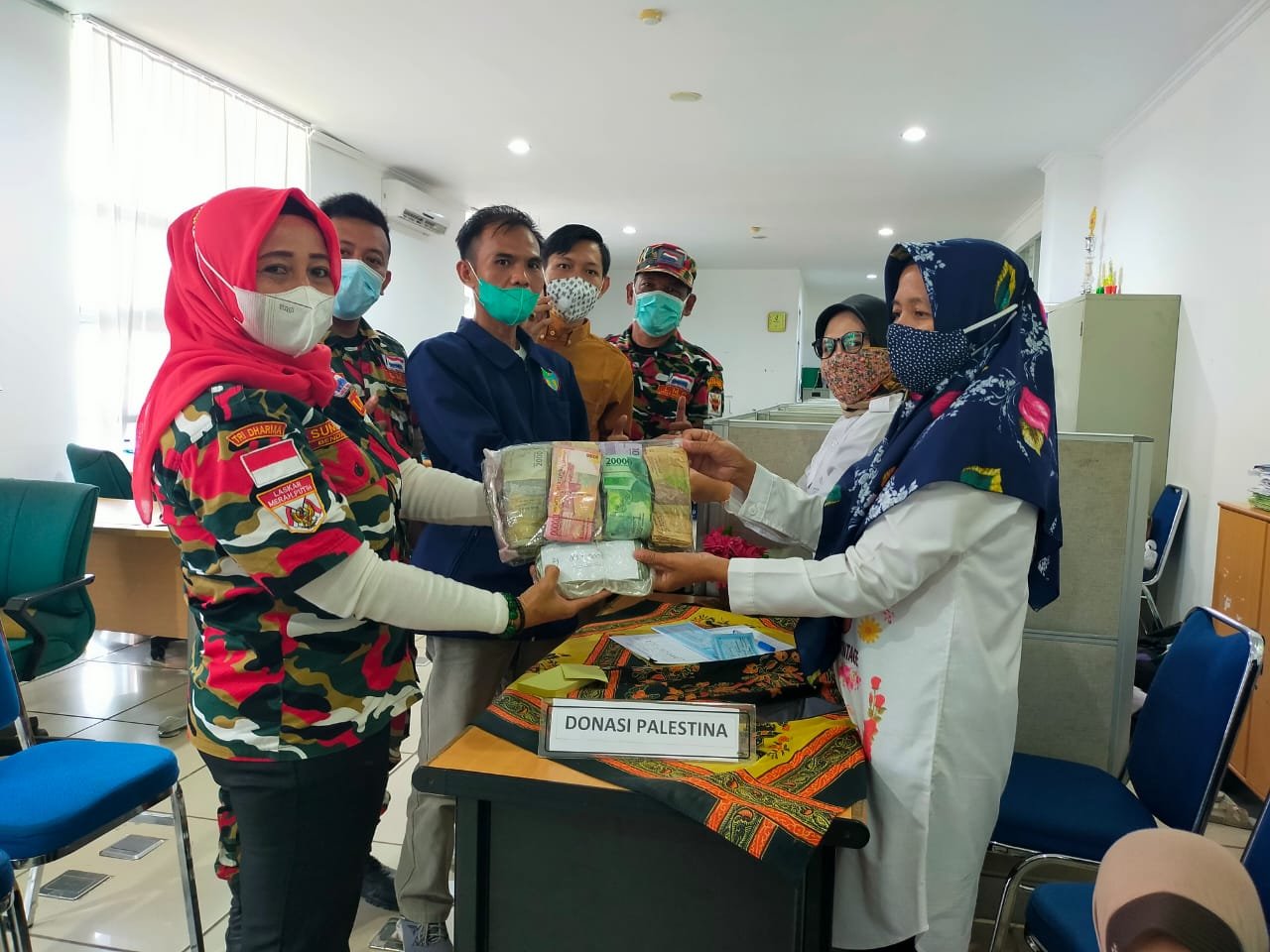 Penyerahan Donasi Muba Peduli Palestina sebesar Rp.10.505.000,- di serahkan langsung oleh Bencab LMP Marcab Musi Banyuasin Ibu Sumarni Kodim bersama Bendahara PD IWO Muba Hasim.