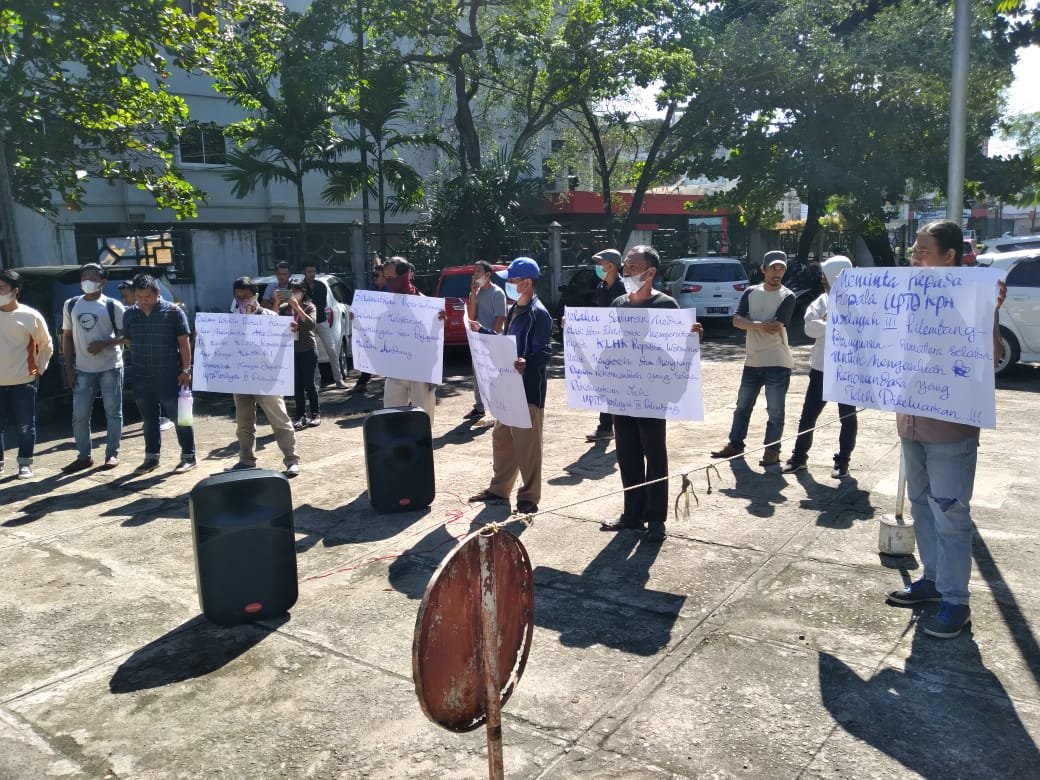 MATTANEWS.CO, PALEMBANG – Belasan Massa dari Lembaga Swadaya Masyarakat (LSM) Amphibi menggelar aksi di depan Kantor Dinas Kehutanan UPTD KPH Wilayah III Palembang – Banyuasin. Rombongan ini pun disambut Kepala KPH Wilayah III Palembang – Banyuasin, Oscar, Jumat (10/6/2022).