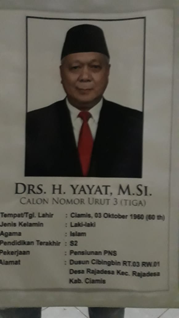 Sekertaris Desa (Sekdes) Rajadesa, Tata Priatna (46) ketika dihubungi wartawan online ini melalui sambungan selular membenarkan, pemenang Pilkades Rajadesa Drs H Yayat, MS.i (60) merupakan pensiunan dari Pemda KBB.