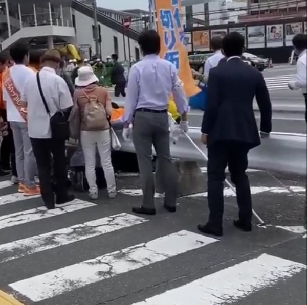 Media lokal NHK menayangkan rekaman yang menunjukkan Shinzo Abe pingsan di jalan, dengan beberapa penjaga keamanan berlari ke arahnya. Abe memegangi dadanya ketika dia pingsan, dengan bajunya berlumuran darah.