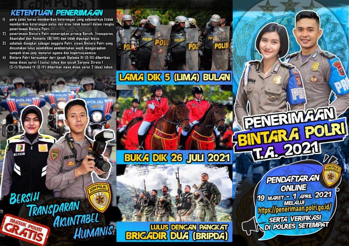 Kali ini penerimaan Polri dibuka secara bersamaan baik penerimaan Akademi Kepolisian (Akpol), Bintara, dan Tamtama Polri. Pendaftaran online dan verifikasi calon hingga dokumen dimulai pada 19 Maret – 1 April 2021. Hal ini diungkapkan langsung oleh Kabid Humas Polda Sulbar Kombes Pol Syamsu Ridwan, kepada media ini, Senin (22/3/2021)