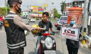 Dalam kesempatan ini, Polres Tulungagung melalui unit Urusan Kesehatan juga bagi-bagi masker peserta aksi begitu juga dengan para pengendara.