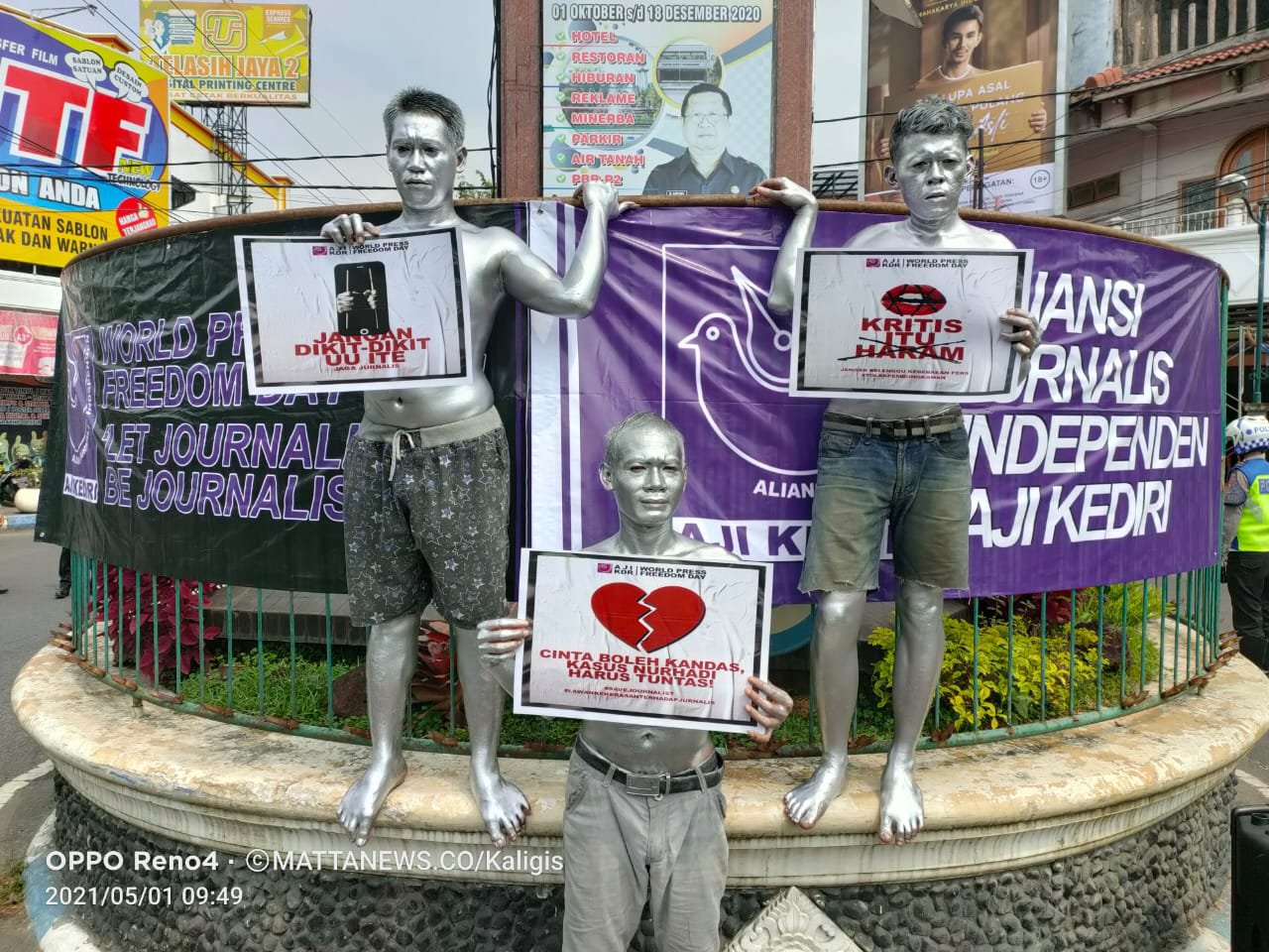 ‘Dalam May Day ini, ikut mensuarakan bahwa hak-hak buruh harus diberikan seperti pada mestinya. Manusia silver ini mereka adalah buruh yang terkena korban PHK,” tambahnya.