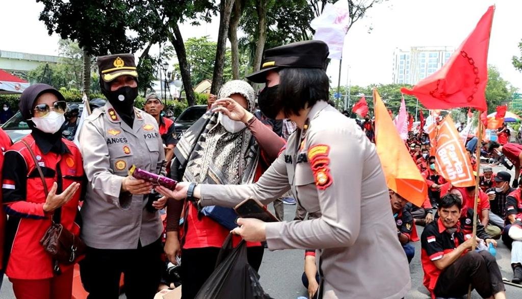 Kapolrestabes Palembang, ada beberapa personil PJU yang ikut langsung terjun membagikan air mineral dan permen kepada peserta unjuk rasa.