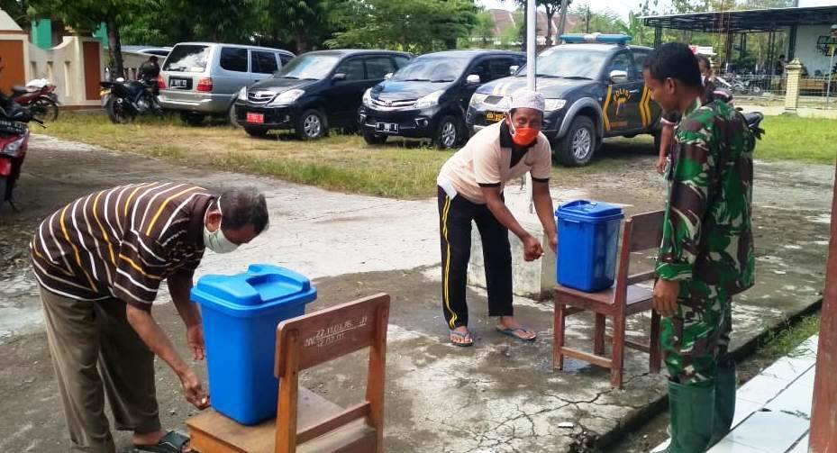 Dari pantauan, saat mengikuti sosialisasi TMMD Reguler ke -108 Kodim Purwodadi di Balai Desa Tambakselo, sejumlah warga, diantaranya Suparno dan Wagimin tanpa disuruh sudah langsung menuju tempat cuci tangan yang sudah disediakan saat akan mengikuti sosialisasi TMMD. (Pendim Purwodadi)