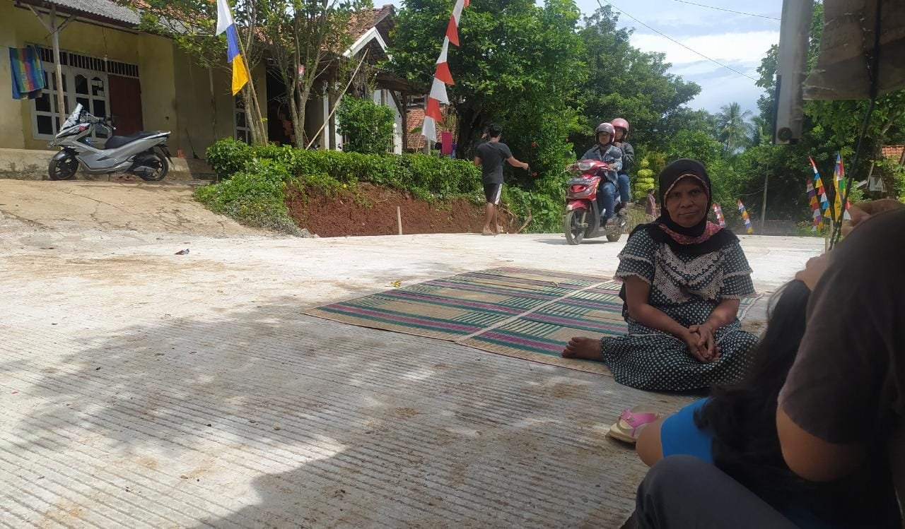 Salah satu pembangunan jalan yang sudah selesai nampak telah bisa dilalui sepeda motor, bahkan terlihat beberapa warga mengelar tikar di sekitaran jalan dengan duduk bersantai bersama kerabatnya.